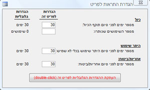 | למרות שבחלון 'טבלת מערכת' (מתוך חלון 'הגדרות') ניתן להגדיר את ההתראות הגלובליות בתוכנה, עבור כל פריט בנפרד ניתן להחליט אם להשתמש בהגדרות הגלובליות, או להגדיר את ההתראות באופן יחודי לפריט זה. |