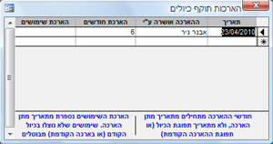 | כאשר מצביעים על כיול מסויים, ולוחצים על כפתור 'הארכות תוקף הכיול', ניתן לצפות בהארכות שכבר ניתנו לאותו הכיול, ואף להוסיף הארכה חדשה. יש להזין את תאריך ההארכה, את שם מאשר ההארכה ואת תוקף ההארכה. |