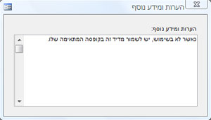 | בחלון זה ניתן להוסיף מלל חופשי המתאר דברים נוספים הקשורים לפריט, ואשר לא מצאו את מקומם באחד מהשדות הספציפיים שתוארו קודם. |