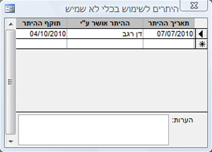 | כאשר מצביעים על תיקון מסויים, ולוחצים על כפתור 'היתרים לשימוש בכלי לא תקין', ניתן לצפות בהיתרים שכבר ניתנו לאותה התקלה, ואף להוסיף היתר חדש. יש להזין את תאריך ההיתר, את שם מאשר ההיתר ואת תוקף ההיתר. |