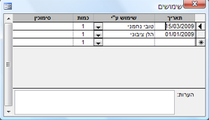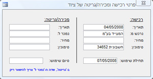 | בחלון זה ניתן להזין את פרטי הרכישה של הפריט, ואת תאריך תחילת השימוש (לאחר הכיול הראשוני). כמו כן, בחלון זה ניתן להזין את פרטי המכירה של הפריט (או גריטה, במקרה ושם הקונה ריק) ואת תאריך סיום השימוש. |