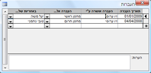 | חלון זה מציג את התנועות והמעברים של הפריט בין מחלקות שונות (או אתרים שונים) וכן שינויים באחראי על הכלי. התנועות מסודרות ברשימה מהמאוחר יותר אל המוקדם יותר, כאשר כל רשומה מכילה מידע אודות תאריך השינוי, מאשר השינוי, המיקום החדש, האחראי החדש והערות. |